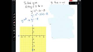 After finding the x- and y-intercepts, we plot the points and draw a U-shaped graph to represent the quadratic function.